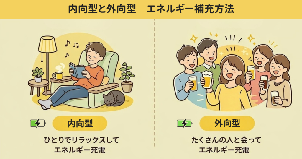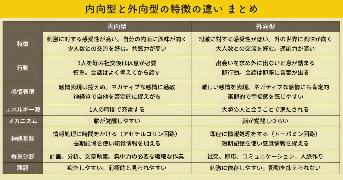 内向型を理解するには、外向型と比較するのが1番分かりやすいです。