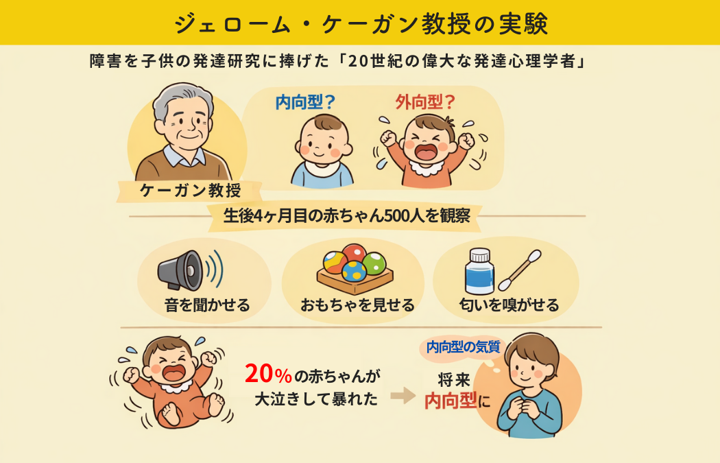 生後4ヶ月の乳児500人を集め、45分かけて観察すれば 1人ひとりの赤ん坊が将来 内向型になるか 外向型になるか予測できるとしたのです。