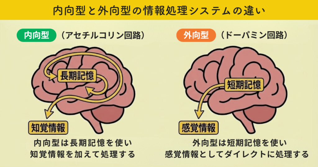 内向型はアセチルコリンという脳内伝達物質が働きやすい構造なので外向型よりも複雑に情報を処理します。